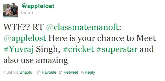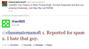 1. How did they assume that I like Yuvraj Singh? Now, obviously, they don’t know jack-**** about people liking or not liking Yuvraj Singh, if you go by the moronic spam machine that is picking a Twtter ID at random and sending them a tweet, like a drone. But, I recall having made fun of Yuraj and Revital, so selecting me for this campaign is wrong on multiple levels.