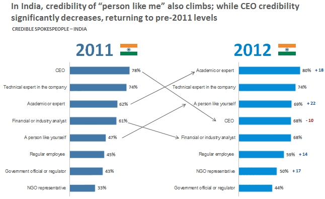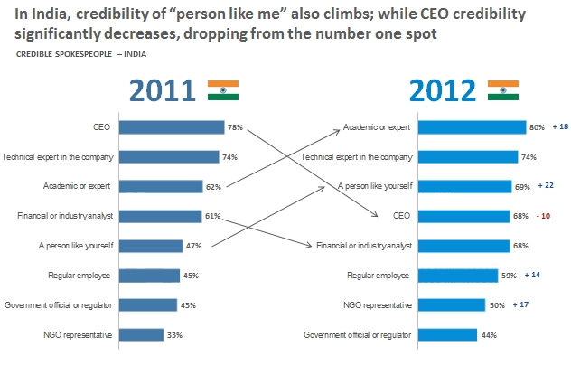 The CEO, the first choice for any PR ‘spokesperson’ is down, in terms of credibility – from being the person with top credibility, in 2011. The ‘technical expert in the company’ retains his/her position at No.2, while the most dramatic rise is by ‘Person like me’.