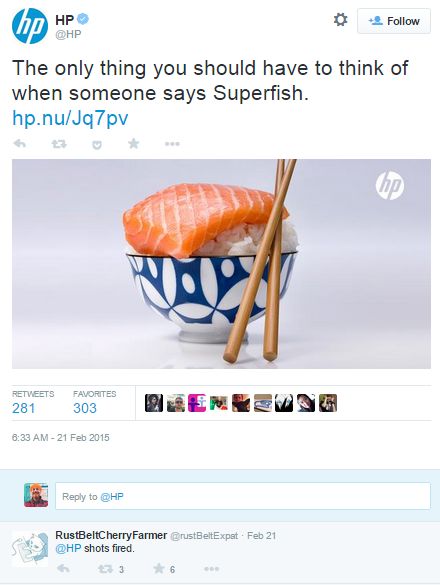 Here’s another case – HP poking fun at Lenovo’s Superfish imbroglio, on Twitter. I’m not sure if HP’s going to take ads to this effect, or if HP’s CEO will make a similar comment about HP not doing a ‘Superfish’, this openly.