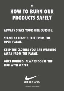 Context: This is a follow-up print ad. This one extends a negative reinforcement, is reactive (reacts to the people who burnt Nike products), but uses a broader medium that reaches beyond the people it is reacting to.