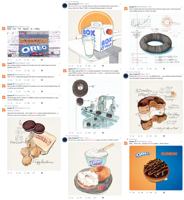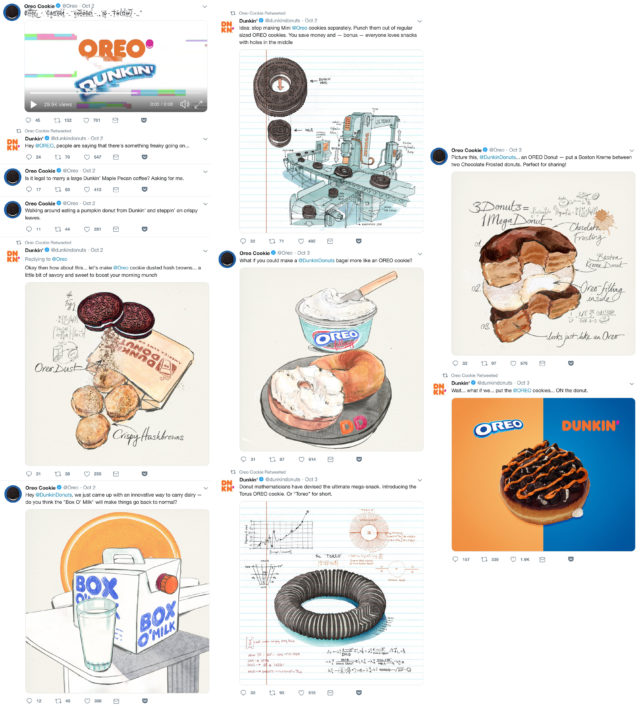 We have seen a lot of brands ‘talking to’ each other on Twitter, in clumsily calibrated dialog sessions. Some of them worked, most of them were terrible. Here’s an interesting, obviously-planned day-long effort for the launch of Oreo x Dunkin’ edition. BBDO was Dunkin’ agency, while 360i was Oreo’s agency. Both worked closely together to bring a day-long brand-switch effort that involved a lot of visual ideas of the new collaboration as a lead to the final reveal. It started with a purported error of sorts where the brands switch personalities with each other. It’s all too obvious and familiar, but the effort in carefully calibrating the day’s tweets, right up to tweeting and retweeting each other as per script is particularly well executed!