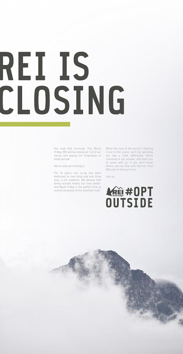 – on Black Friday 2015, REI’s website featured a black takeover screen that encouraged customers to #OptOutside!