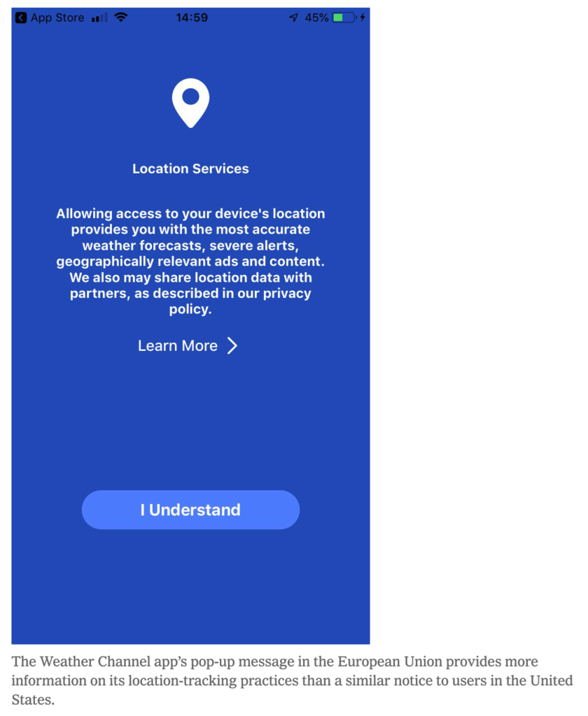 But, the way The Weather Channel prompts people with the location-access pop-up is different for the US vs. Europe.