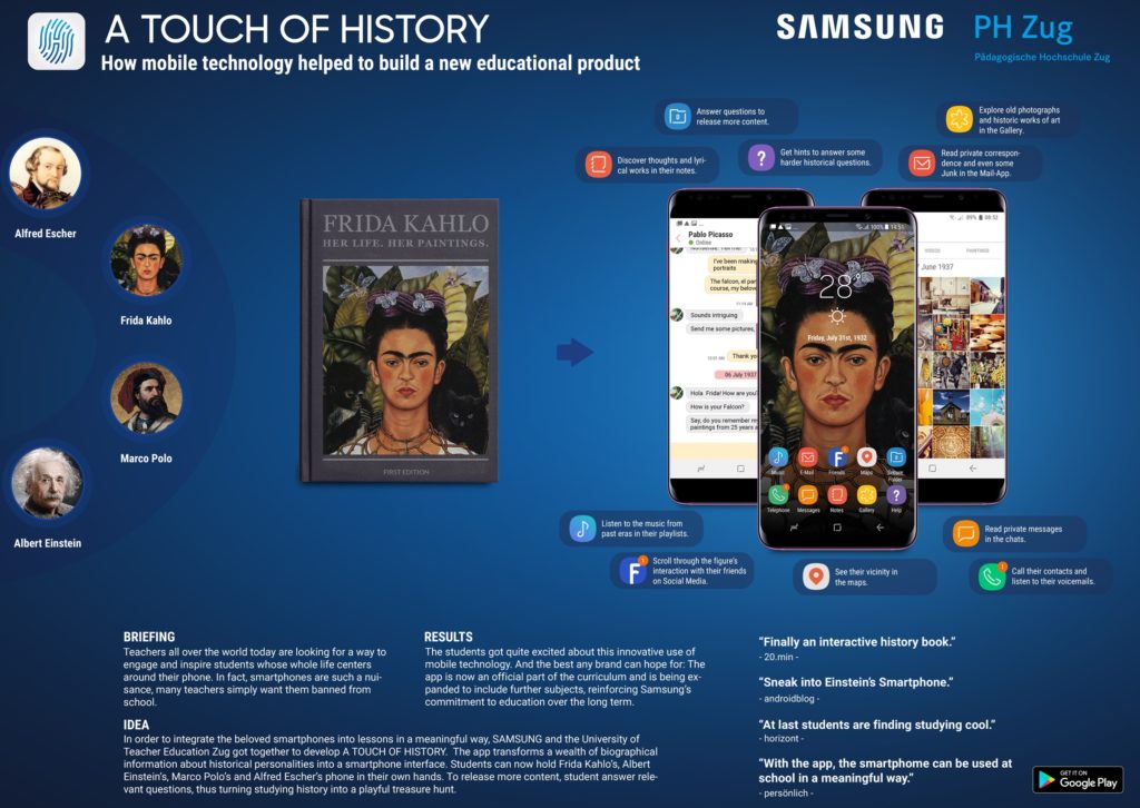 A nifty idea by the Swiss agency Jung Von Matt/Limmat, for client Samsung. They created a smartphone app which has biographical information about well-known historical figures from school students’ history books. But, instead of just presenting that information the way they are, in history books, it was offered through the app in a very smartphone’ish interface – the entire phone into that historical figure’s phone!