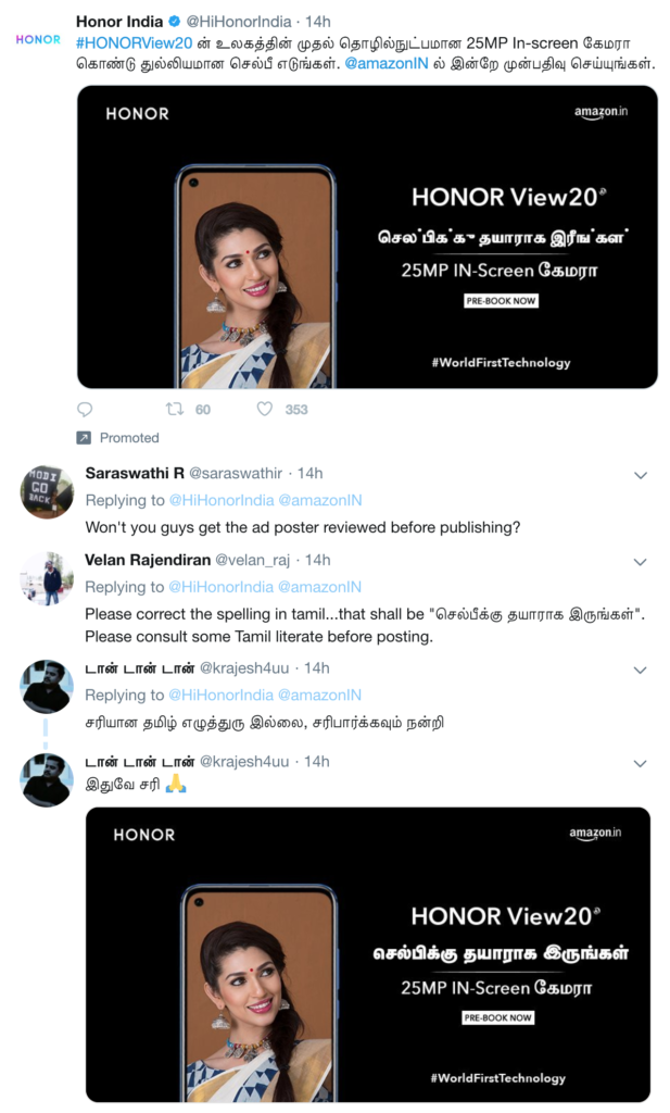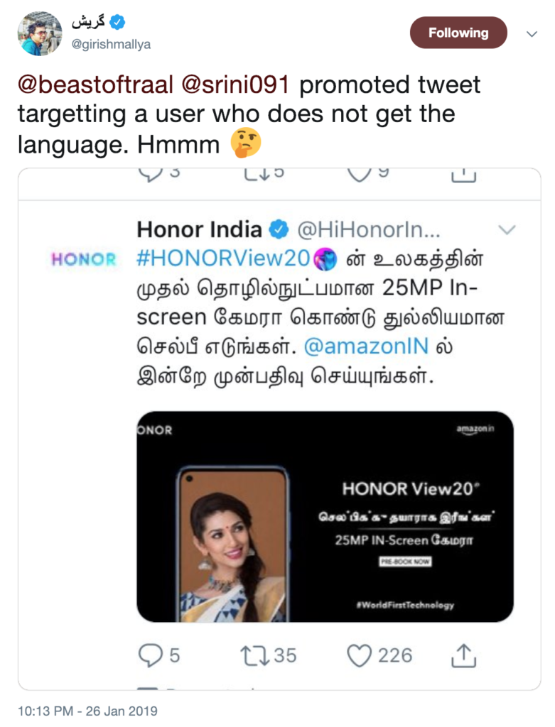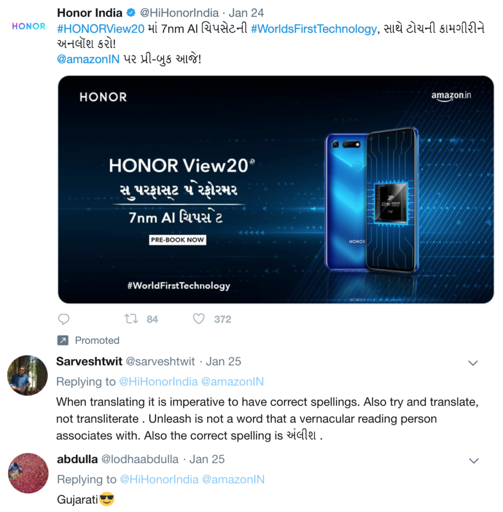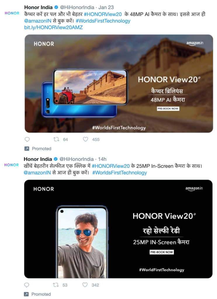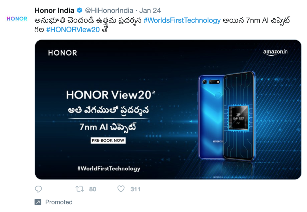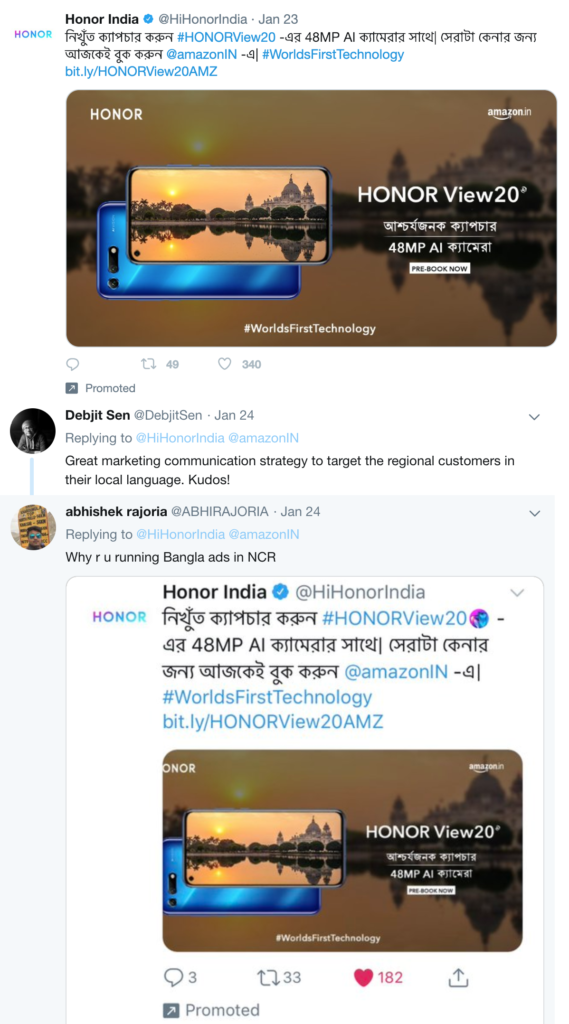 I’m really glad to see Honor India exploring regional language advertising on Twitter. All these are promoted tweets, incidentally. I have added some user feedback too, about the effort, under some of the tweets.