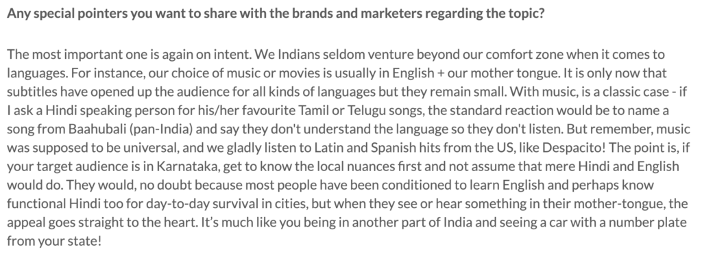 This I do understand – the science of targeting sharply on language, in a complex country like India is going to be difficult. If you use geography as criteria, you cannot account for out cosmopolitan metros where most people are likely to know more than one language. Twitter, by nature, has very limited language related information about users and can only make guesses about their mother tongue based on assorted signs from their tweets.