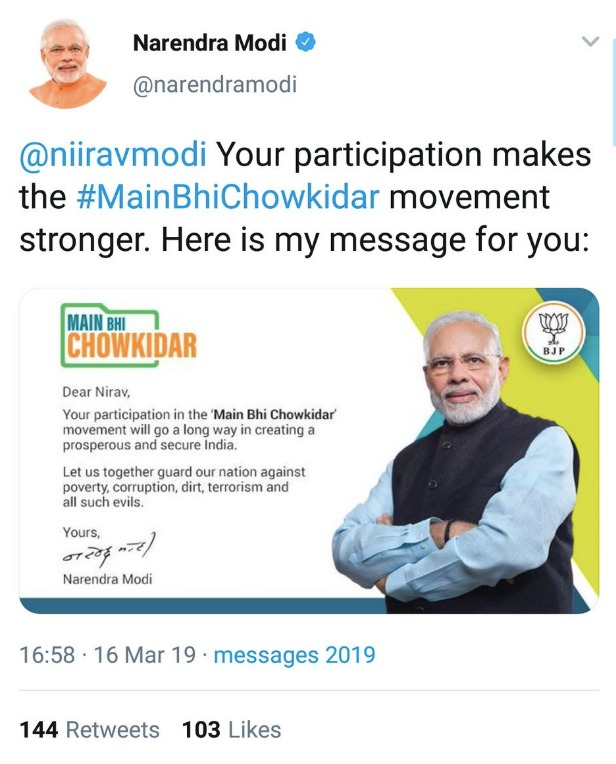PS: Modi’s latest ploy was to turn a word his detractors were using to denounce him (Chowkidar Chor Hai), into a word in his favour (Main Bhi Chowkidar).