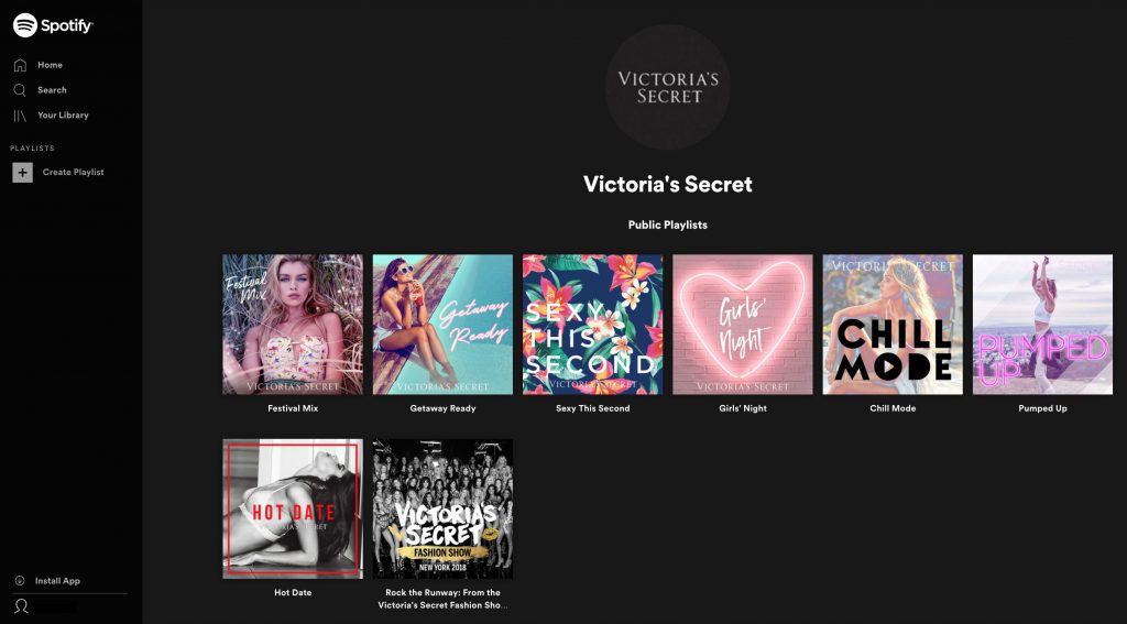 Victoria’s Secret has a set of playlists titled ‘Hot Date’, ‘Girls Night’ and so on – relevant to its brand and its customers.