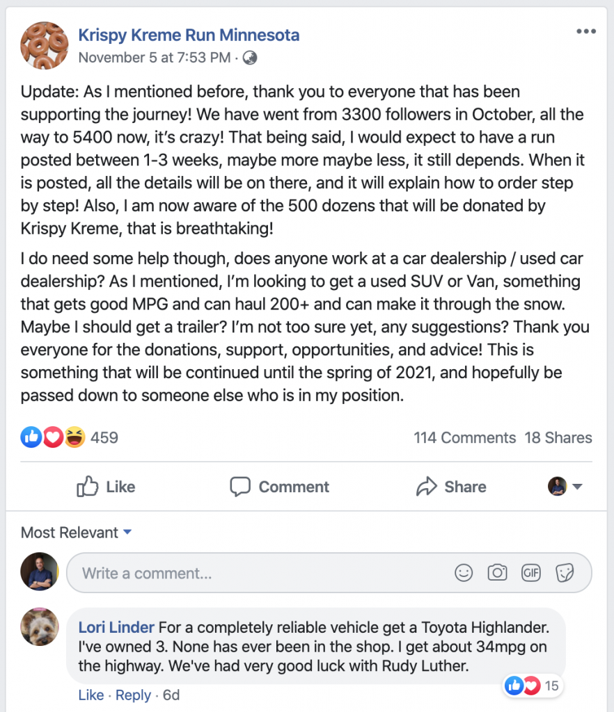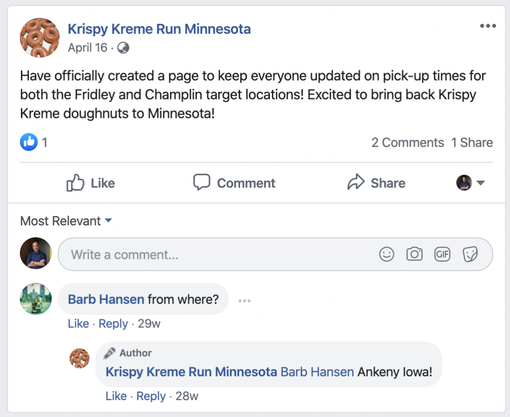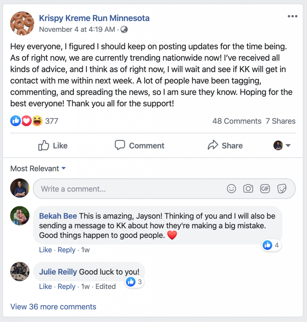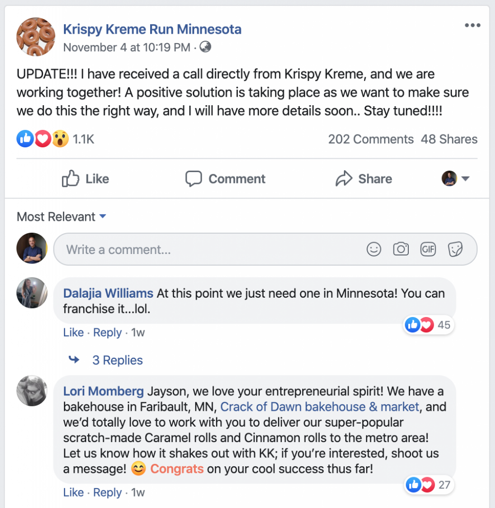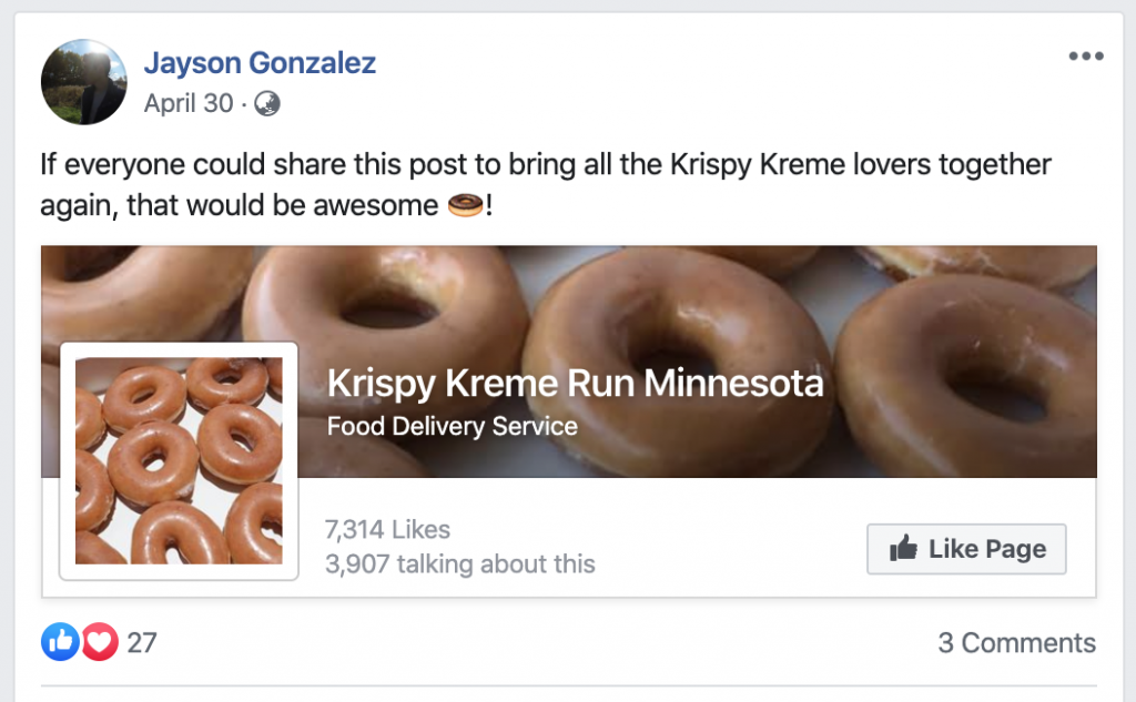 That post got 300+ replies. So, he thought that there is demand for the brand’s donuts and set up a Facebook page called ‘Krispy Kreme Run Minnesota’.