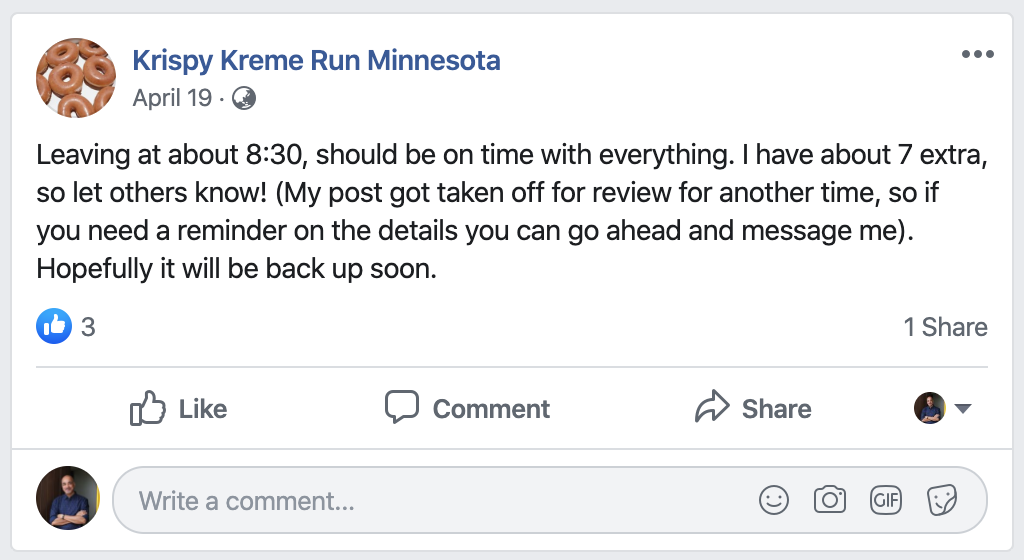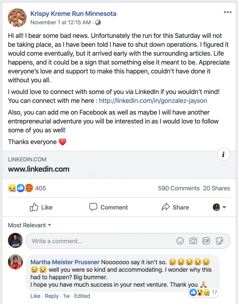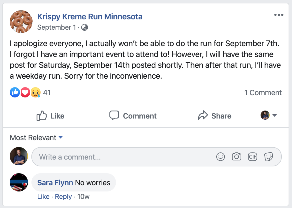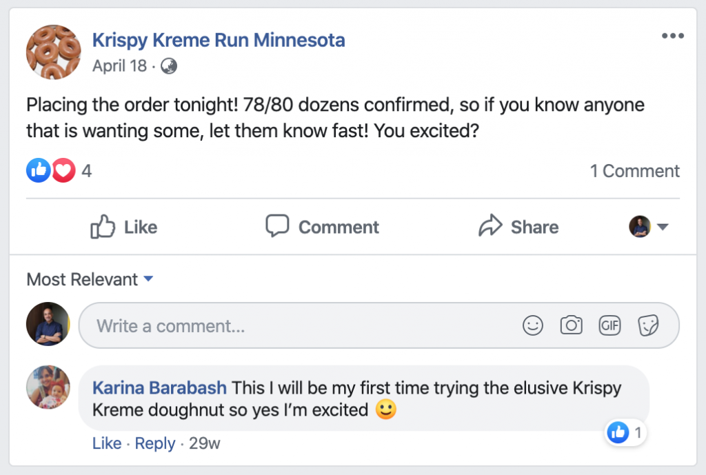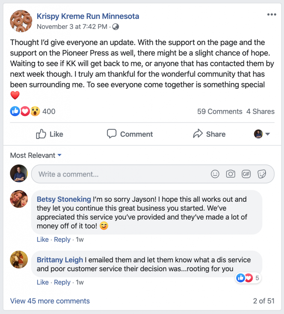 That post got 300+ replies. So, he thought that there is demand for the brand’s donuts and set up a Facebook page called ‘Krispy Kreme Run Minnesota’.