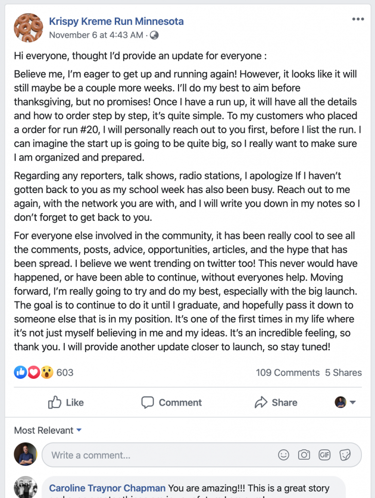 The comments under his post turned to his favor thanks to his tone. And Krispy Kreme noticed this turn of events too. And finally understood that this was all the good for them – there is an established delivery operation, with a lot of demand, in a location that they do not operate in! They just need to work towards legitimizing it and take advantage of the whole thing. Which they goofed up the first time by simply asking him to stop.