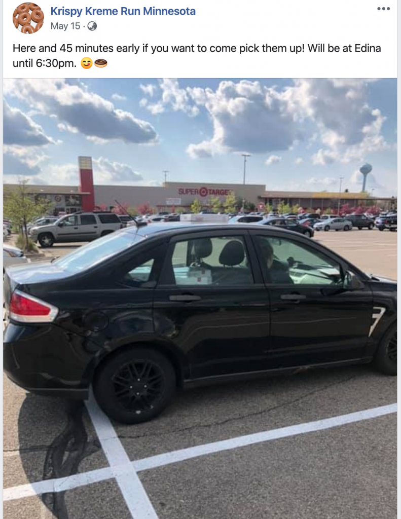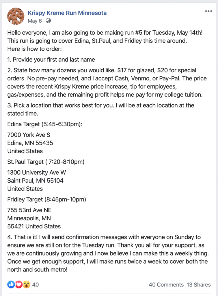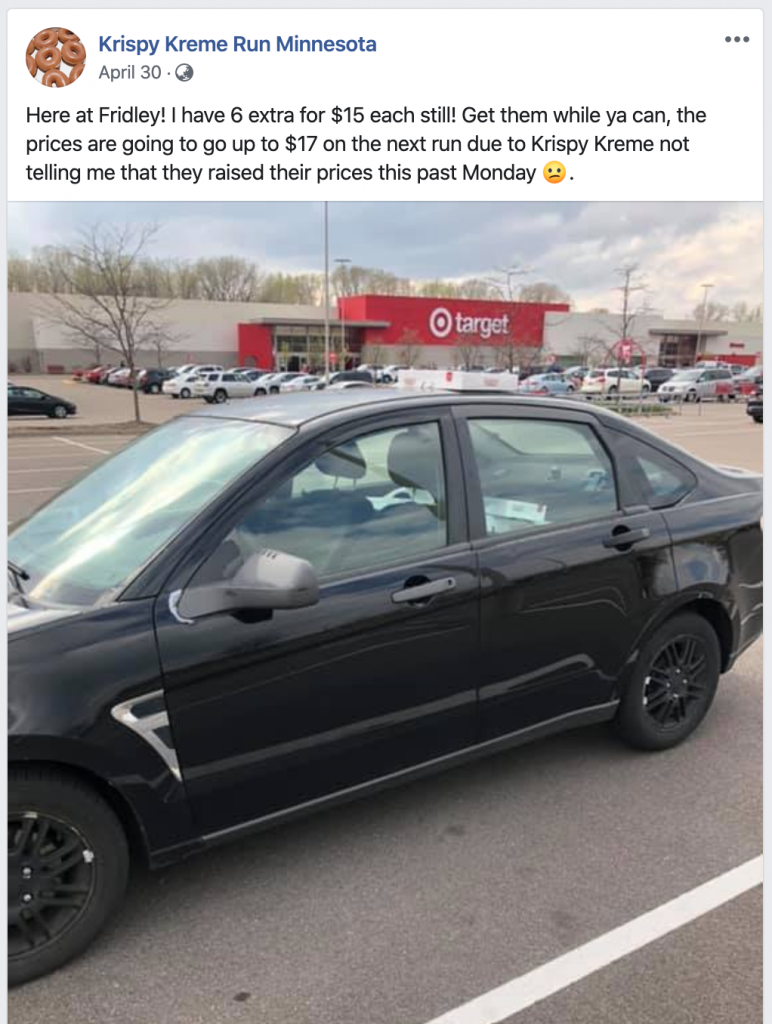 Then he parks his car at Target store parking lot on the way back (cities like Burnsville, Bloomington, Minnetonka, St. Louis Park, Little Canada, Fridley, Brooklyn Park, Coon Rapids) with a Krispy Kreme pack on the top. People in those cities see his route on the Facebook page, pull up next to his car and buy the donuts, usually at double the price ($17 to $20 per box for a box that costs about $7.99. That’s a profit of about $9 to $12 a box, excluding fuel cost, car maintenance and his effort/labour cost).
