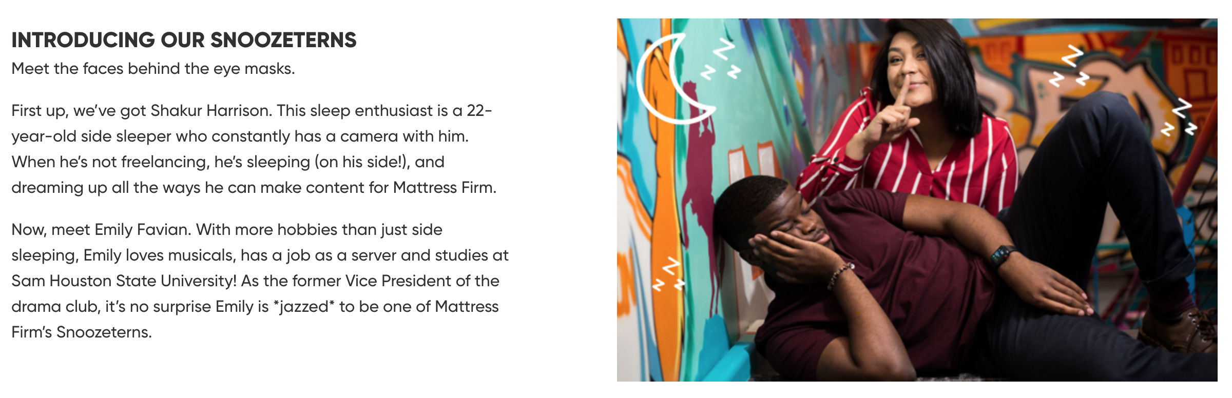 And MattressFirm has been consistently on this campaign, creating multiple seasons and many more Snoozeterns, !