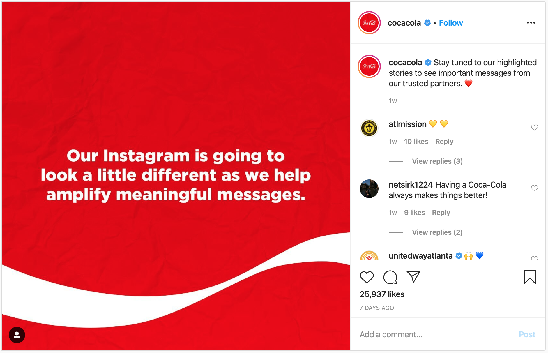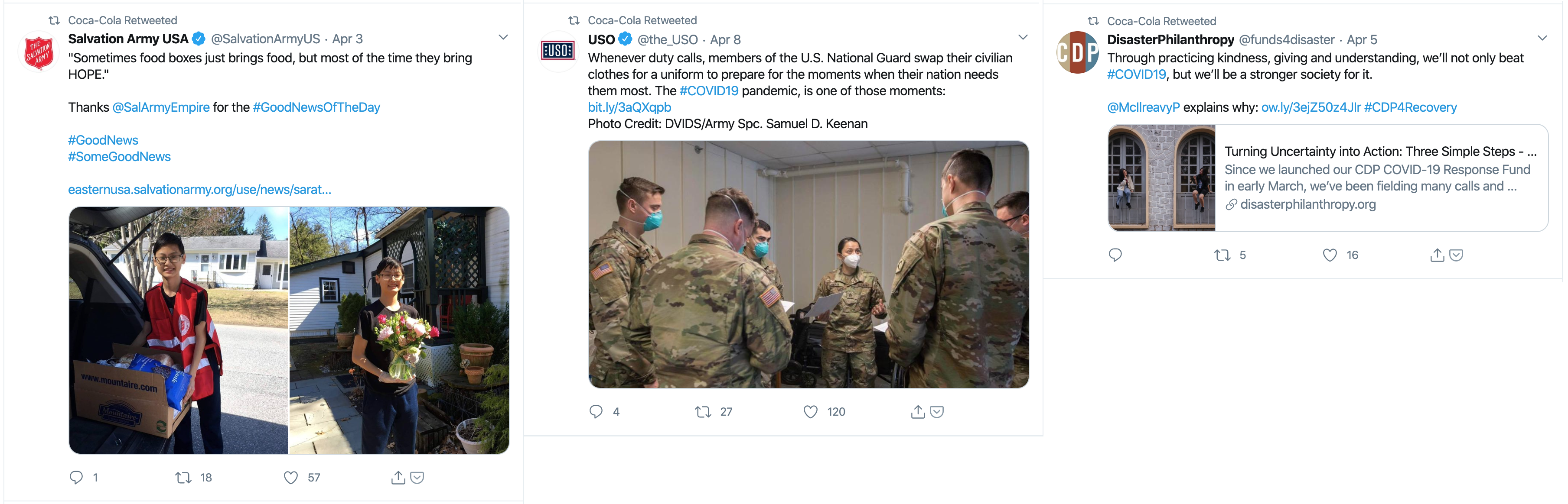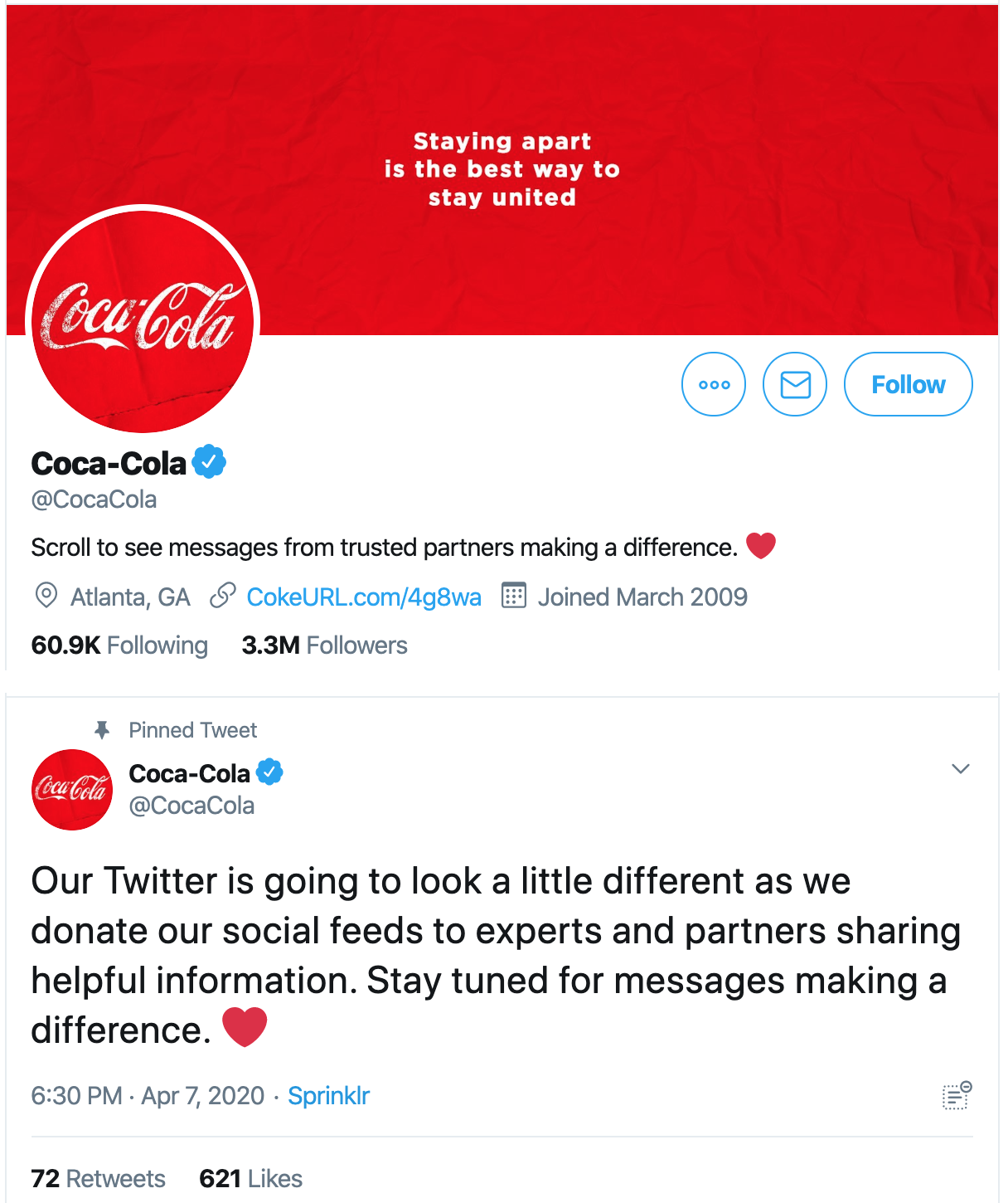 This is a great tip for your brand too. If your brand is a ‘want’ and not a ‘need’ at this point, consider pausing your regular programming and find other, smaller handles and causes that you can amplify using your brand’s handles and be their voice.