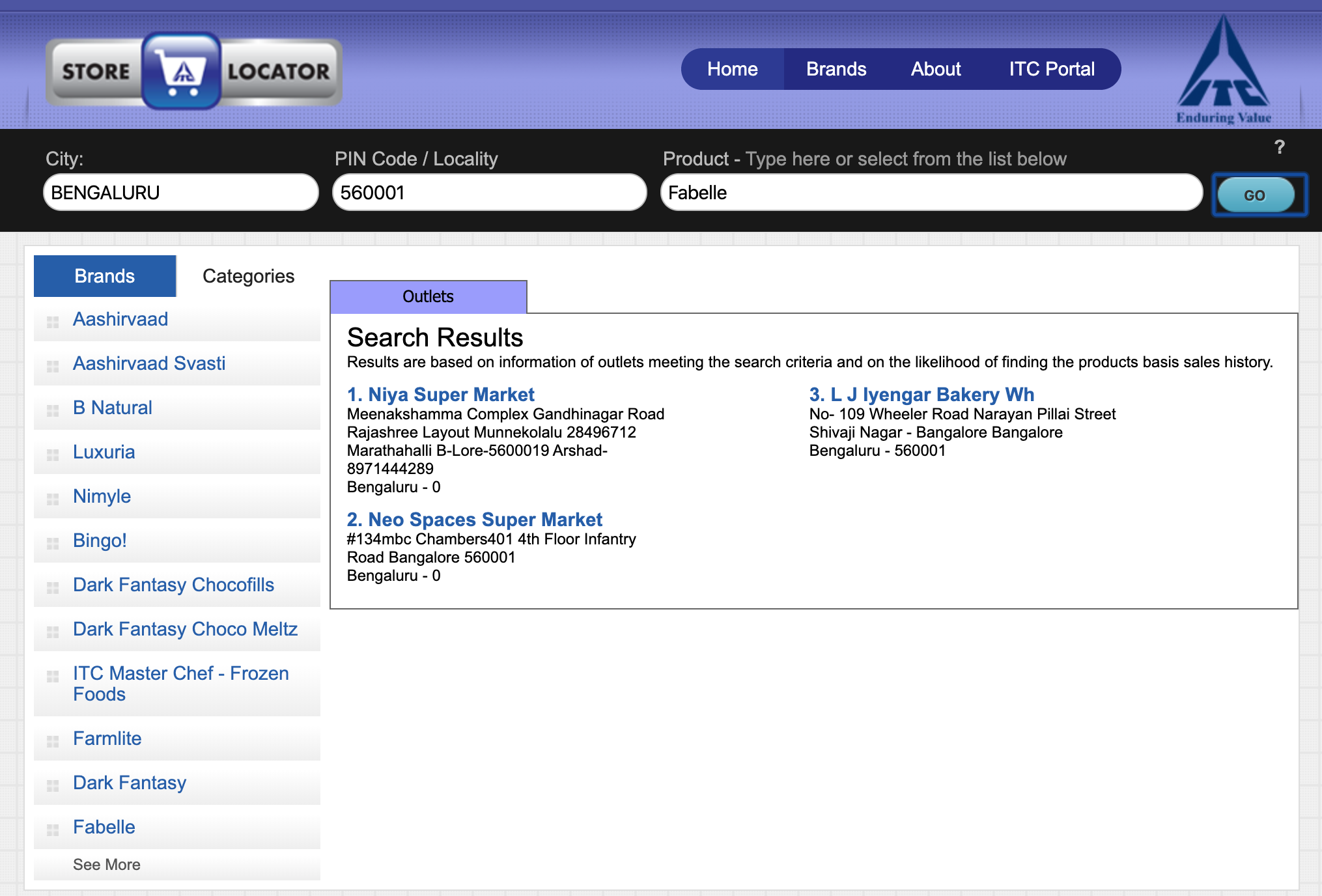 ITC has an like that. You select the city, enter the pin code and type in a product from ITC’s expansive range… and the locator will tell you stores near you that you can buy that product from.