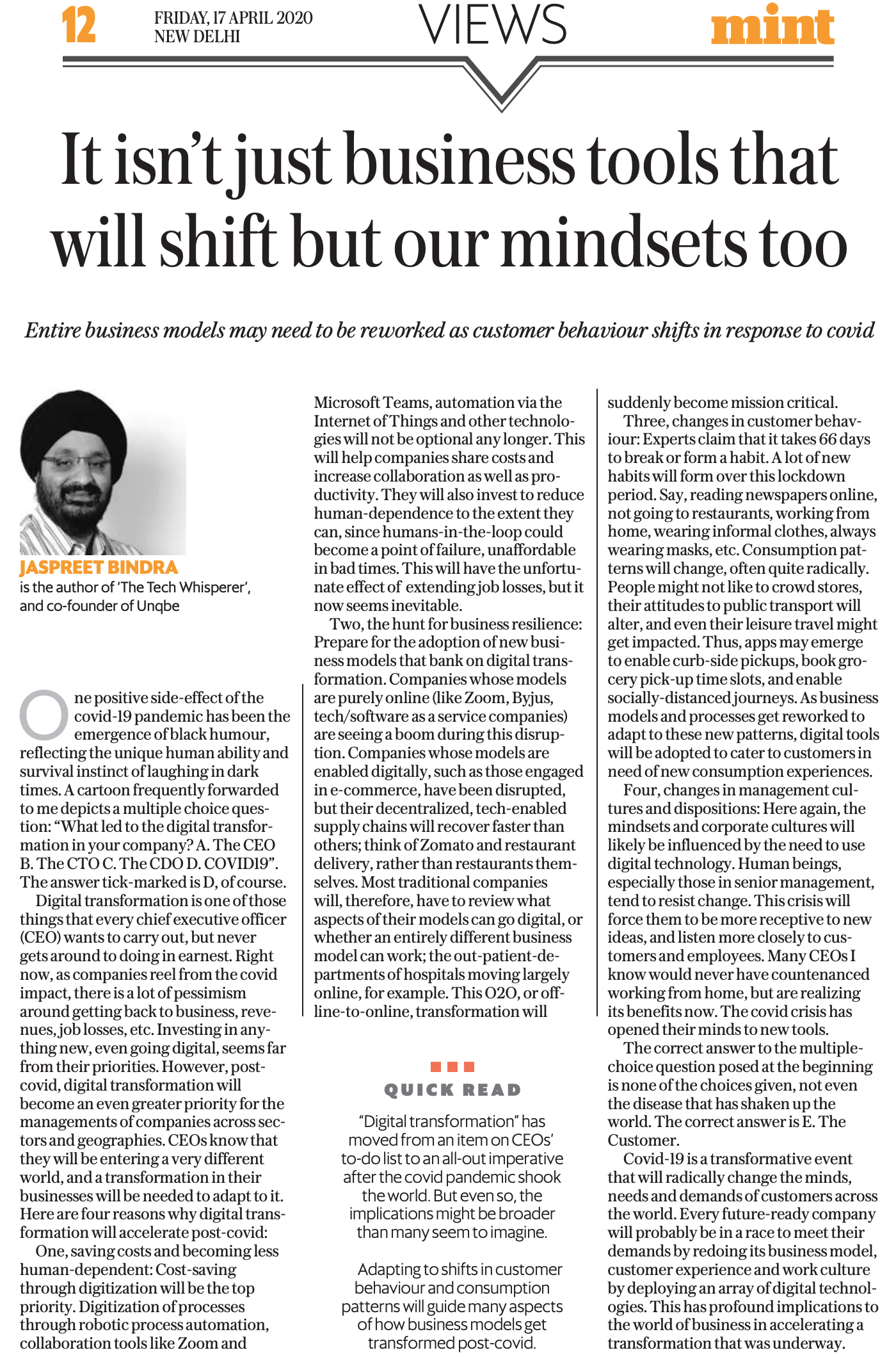 On a related note, here’s a view on COVID-19 accelerating digital transformation, from today’s Mint.