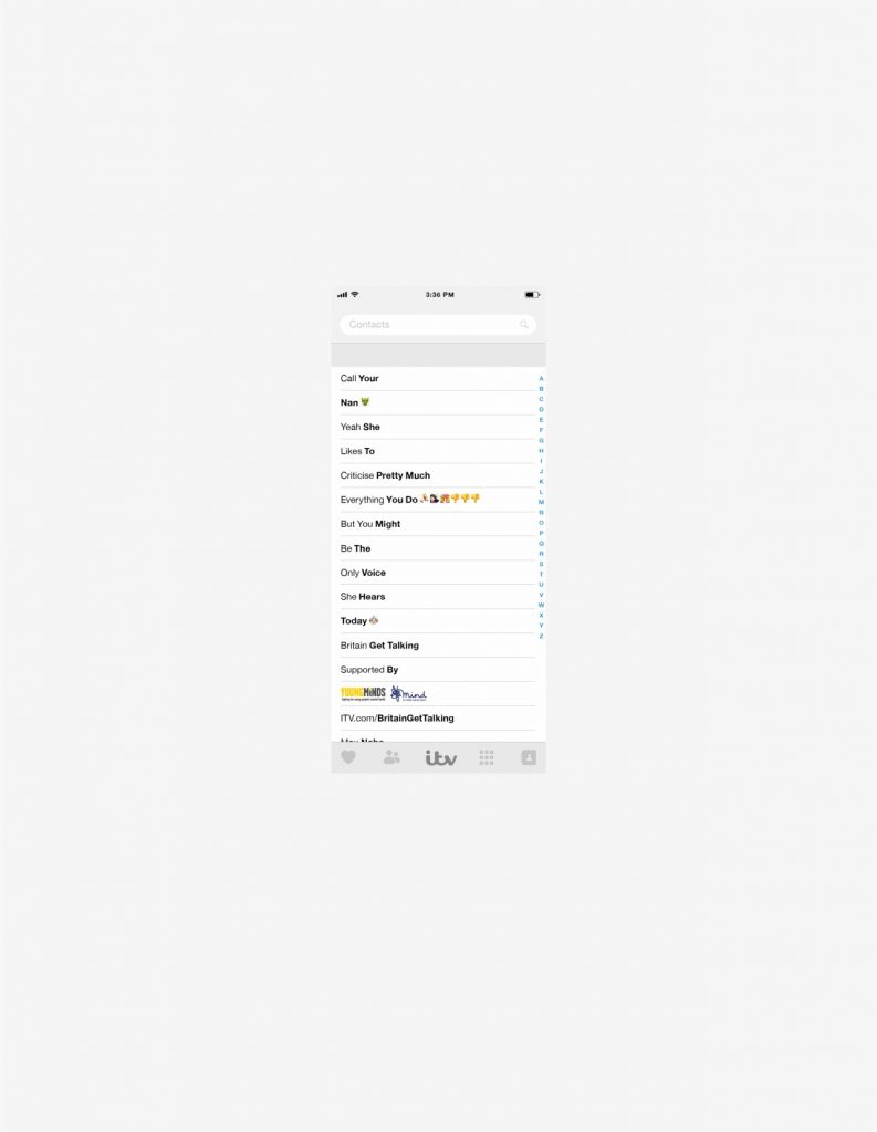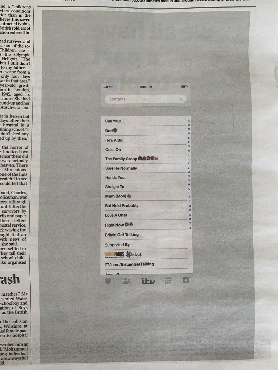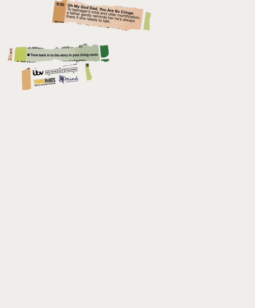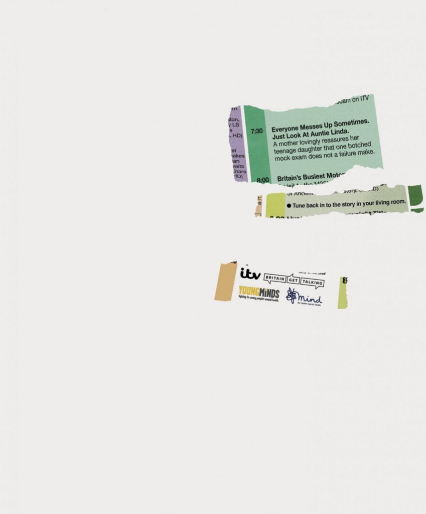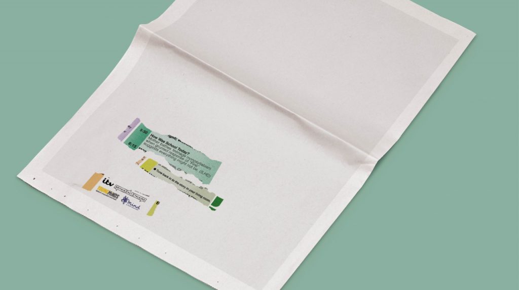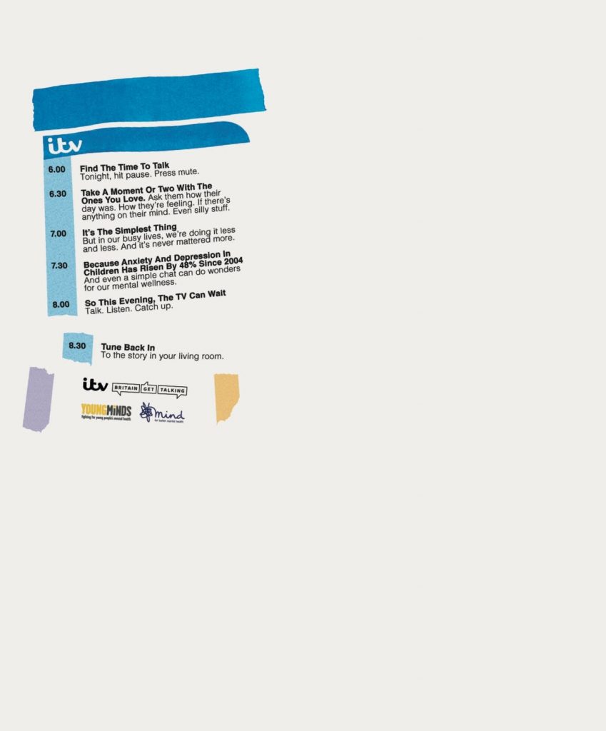 As a follow-up to this launch, Uncommon and ITV unveiled a print advertising campaign in late October 2019. The creative idea was very inventive – it used what looked like ripped out TV listings (connects back to ITV!) but instead of actual TV listings, they have a call-to-action related to talking to each other. And given how sparse and minimal it looks in a full-page, it attracts attention immediately!