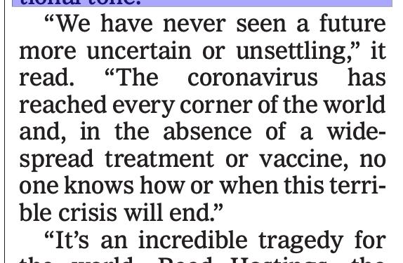 The first paragraph is a sober, no-holds-barred reflection of the devastating impact of the coronavirus.