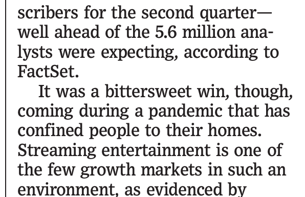 My favorite part was, “We expect viewing to decline and membership growth to decelerate as home confinement ends, which we hope is soon“. The focus was razor-sharp on the ending of the trouble people are in due to home confinement, even as it could have been to celebrate the spectacular membership numbers albeit for one quarter. But the realization that any kind of even mild forms of celebration would be completely at odds with human suffering makes them temper the success in a solid dose of reality.