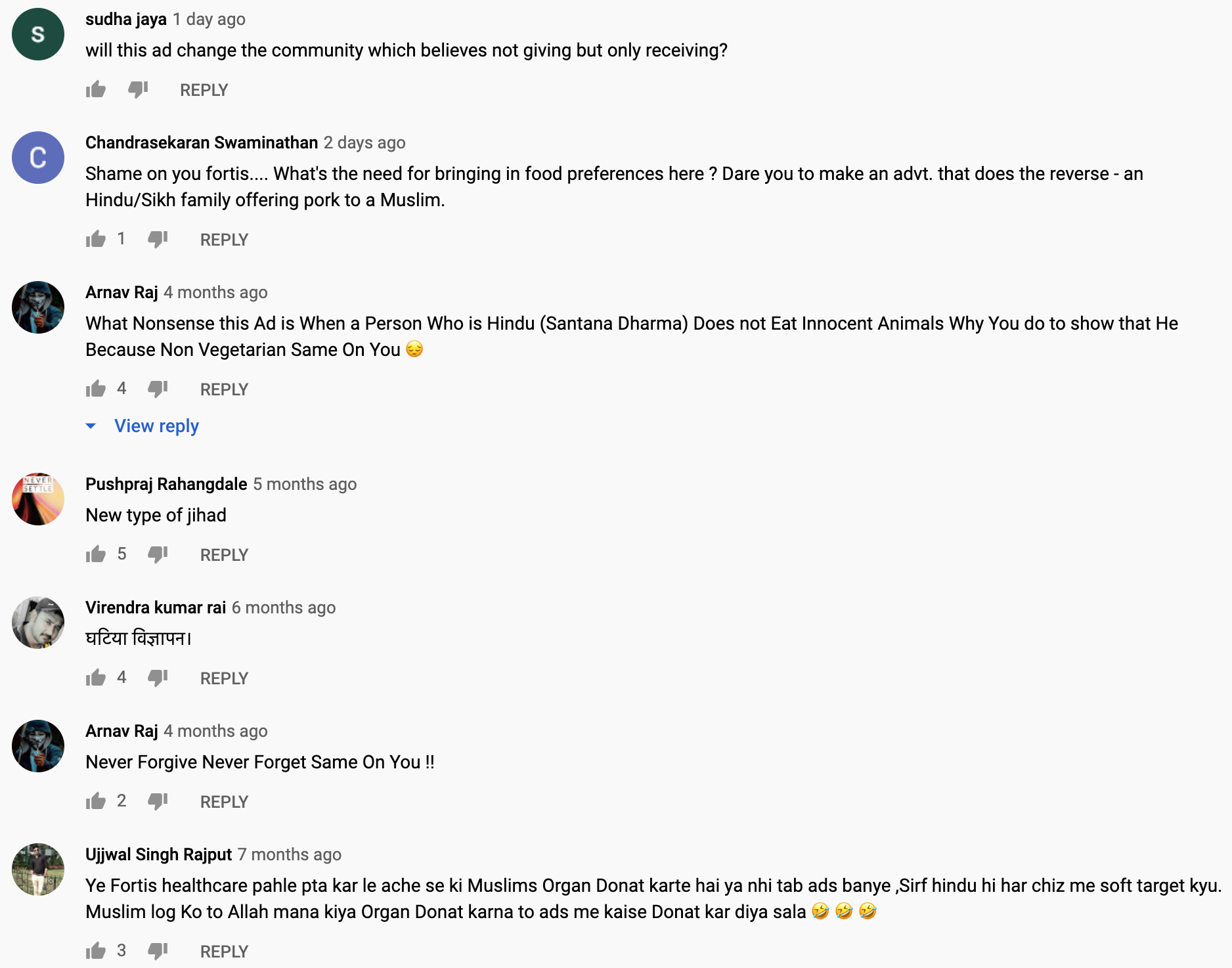 There is also the suggestion that the film should have swapped the religions (even though the younger couple’s religion is not clearly indicated at all, unlike the Tanishq ad) – a young Muslim couple visit the Hindu donor’s family, and that the Hindu family should serve them pork. The question is, why would any decent, well-meaning and considerate Hindu family serve pork to someone who is obviously Muslim? Why would anyone want to be knowingly vile? And why suggest that the ad show Hindus as being intentionally mean?