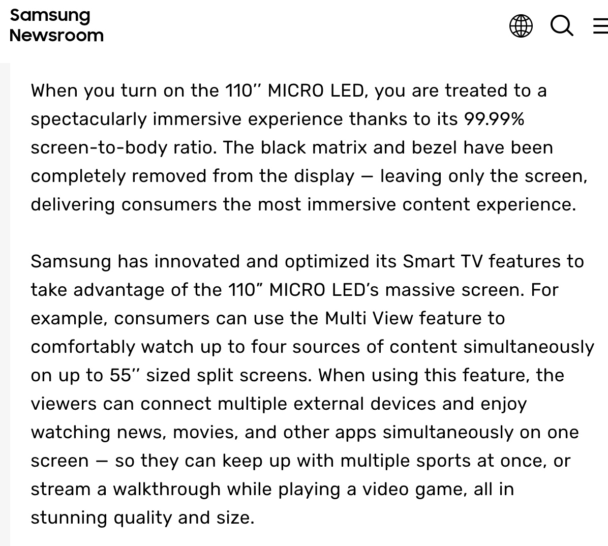 On a related note, Samsung has announced a 110” Micro LED TV that has a Multi View feature to lets you watch up to four sources of content simultaneously on up to 55″ sized split screens, by connecting 4 external devices to each of the 4 modules!