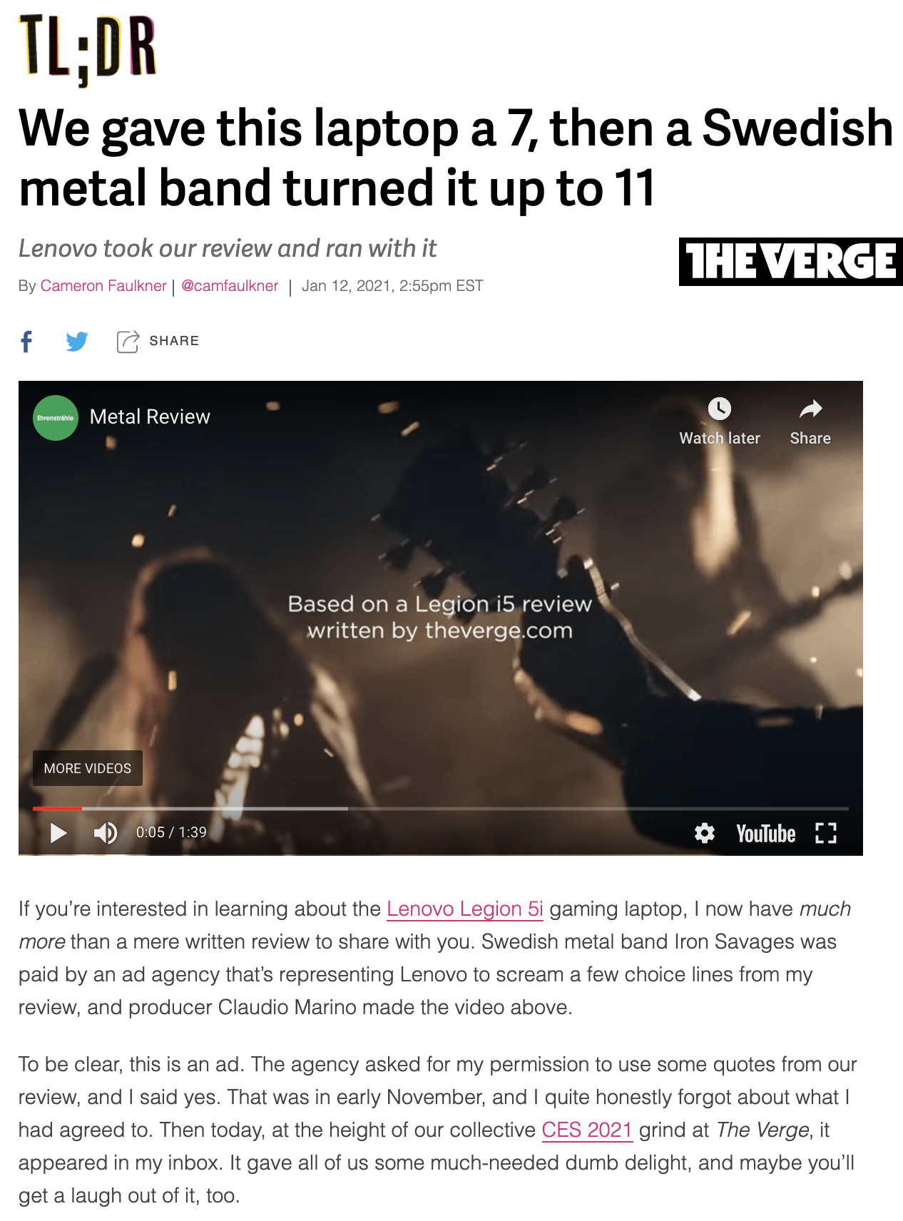 Interestingly, the idea of these reviews gave Lenovo another opportunity to be featured in Verge when they noticed these unique review music videos and wrote about that too!