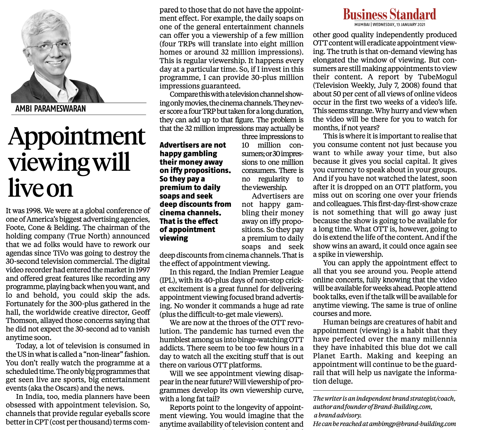 Live content is the last bastion of appointment viewing. Not impromptu live content (news that breaks), but pre-planned live events like sports, award ceremonies, important political speeches/occasions (swearing-in ceremonies), etc. But, to be fair, live events are appointment-based participation – there is a window of opportunity to participate in something happening then and there, and hence, much like the linear TV broadcast. If you miss it, the charm of catching it live is gone forever.
