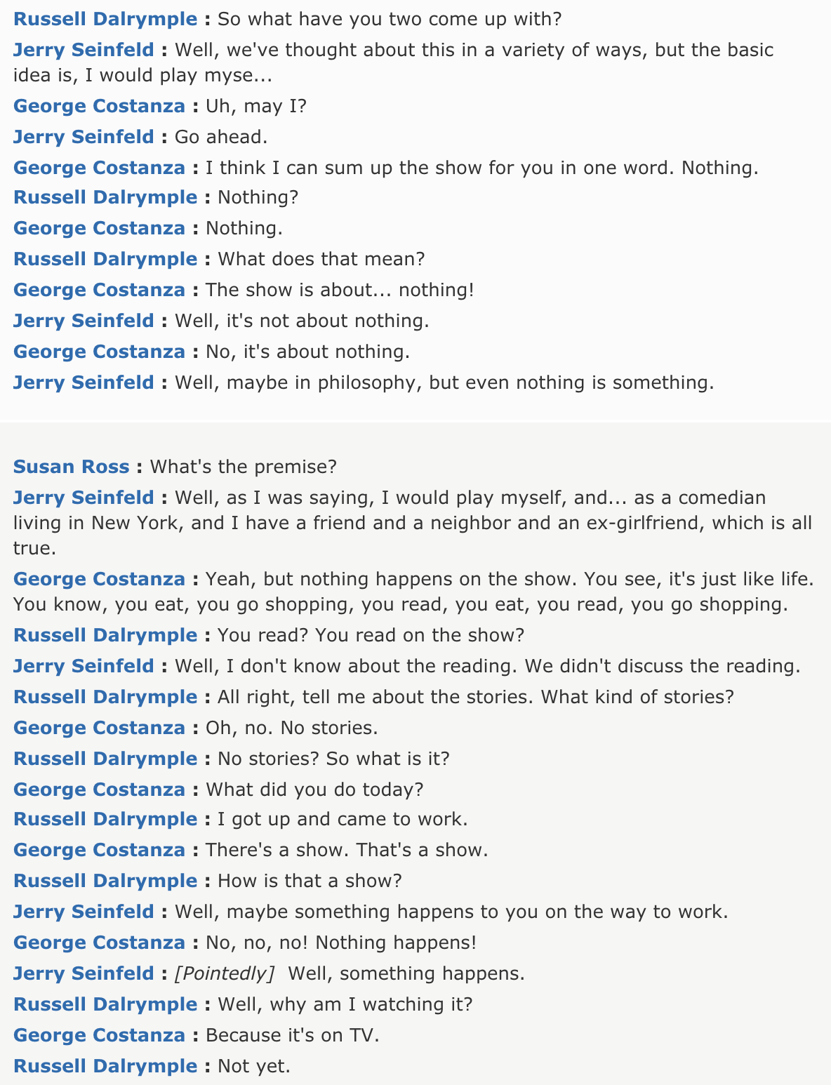 Nothing explains how outmoded appointment viewing is better than the Seinfeld episode The Pitch! In the episode, a cocky George and Seinfeld are pitching for a show where nothing happens. The only thing given is their confidence that people are already waiting because it is on TV. Why? Read on 🙂