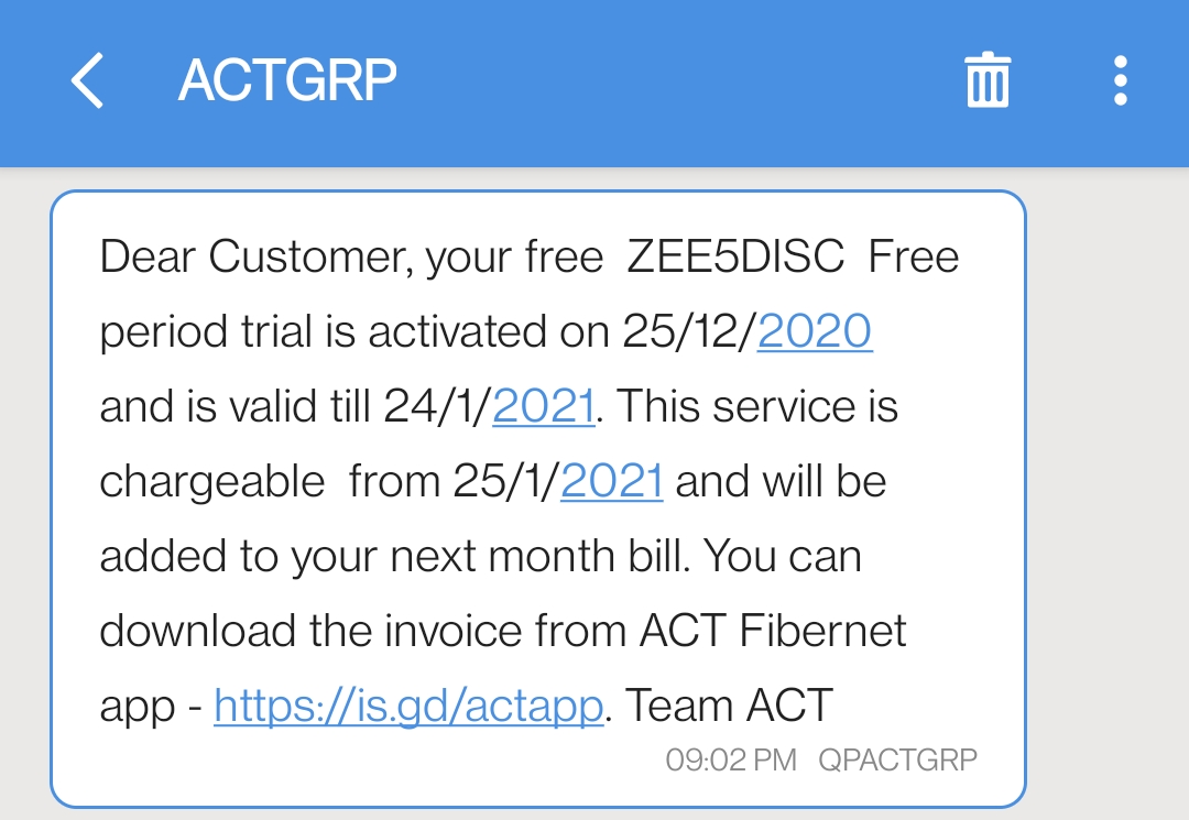 I figured earlier this week that I have not seen Zee5 since January 2021 in the assumption that after the first month I won’t have access to it anyway. But ACT has been charging me Rs.99 for it every month and it is mentioned in their monthly bill too. I had to call ACT to cancel this unwanted subscription.