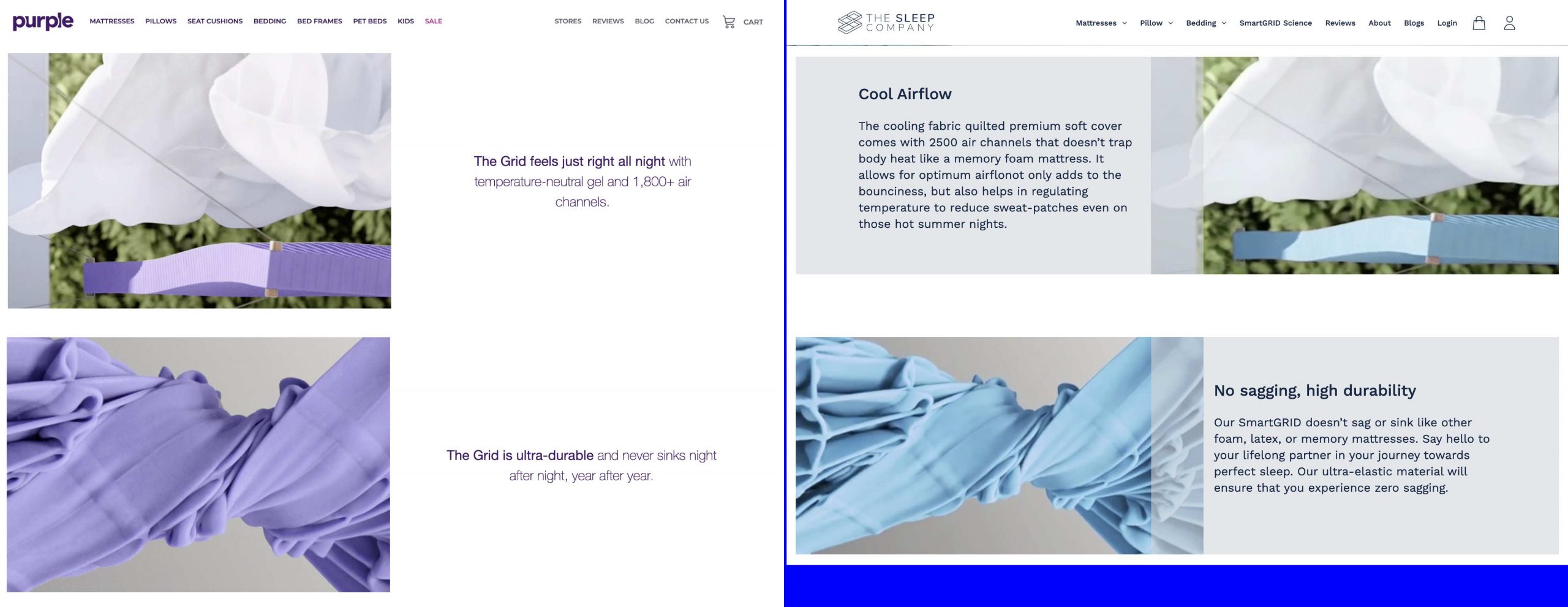 But Purple talks extensively about their own technology and patents (a LOT of them)! And The Sleep Company talks about DRDO and ‘Japanese-sourced SmartGRID technology‘, muddling the origins of how they came about the grid idea (that looks so much like Purple’s grid).