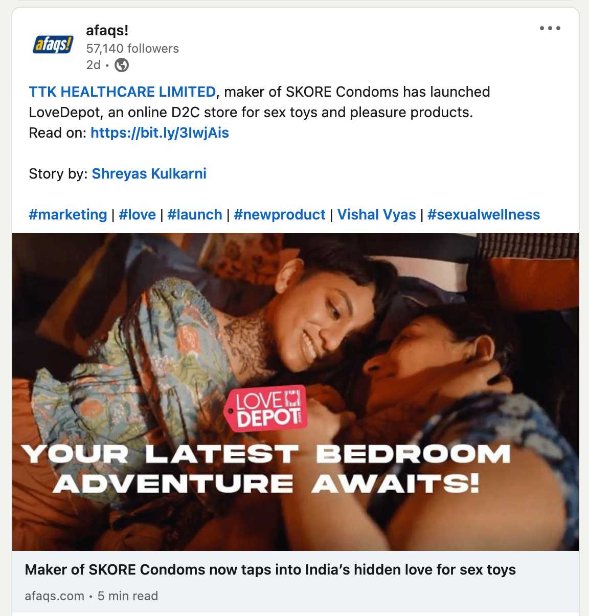 If that was the case, I wonder if The Glitch, the agency, or TTK Healthcare, the owner of Love Depot, could get away by sharing their professional piece of marketing communication on LinkedIn! Or, would they need to merely link the piece of work and not natively upload the video?