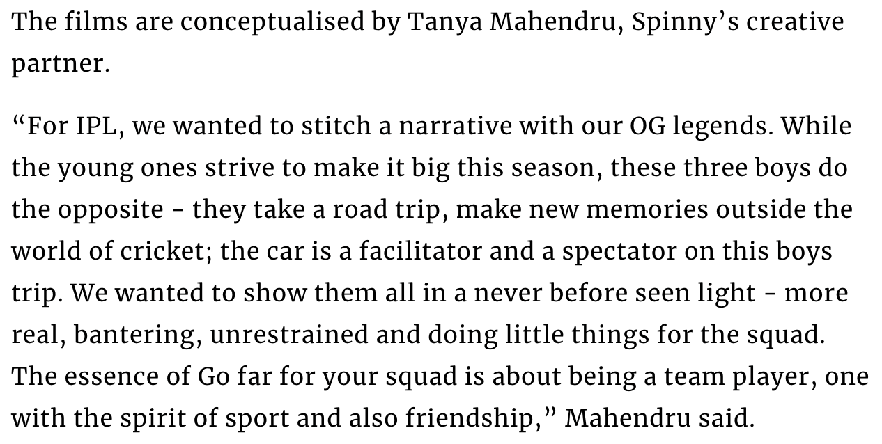 If you remove the Spinny branding and add BMW branding, for instance, the ad would still make perfect sense. In fact, it may be a bit more appropriate given these cricketers’ standing.