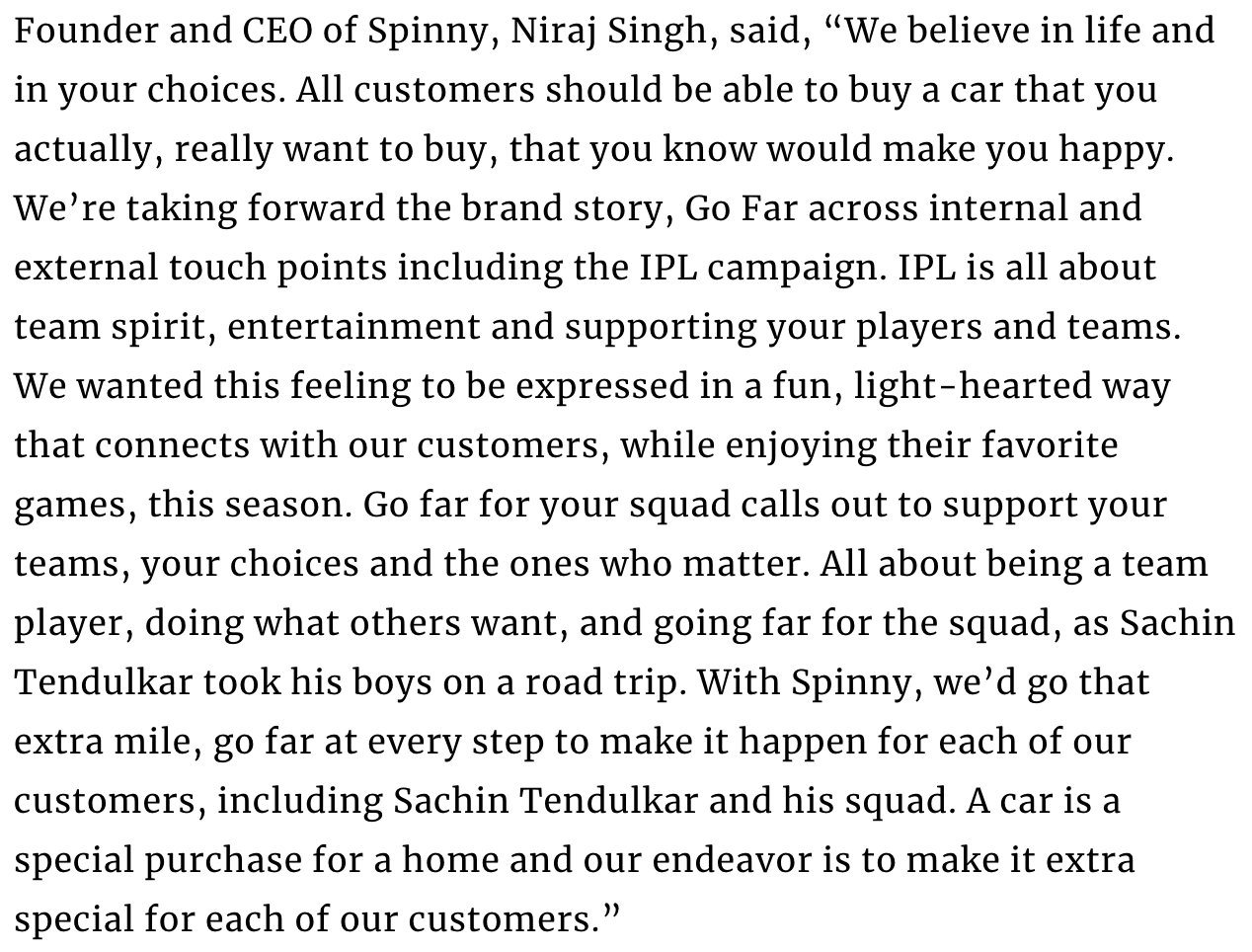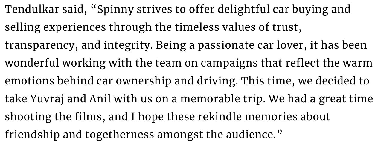 For instance, I wouldn’t be surprised if Spinny’s 4th national campaign has Sachin driving (a used car, of course) to popular tourist spots in India drive. He could be driving from Mumbai to the Statue of Unity… and Spinny logo.