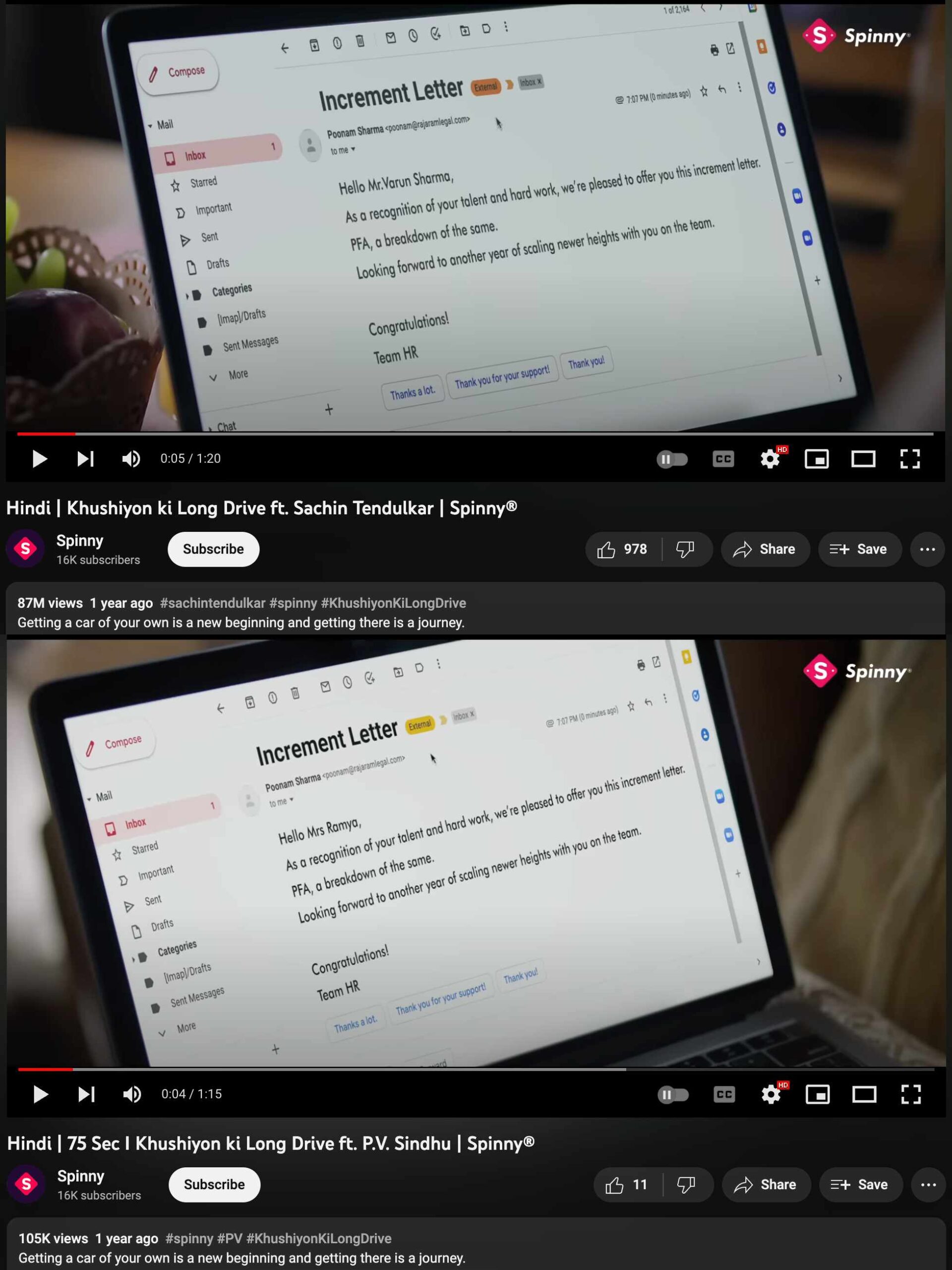 The agency took care of the nuances well too, between the 2 variants – Sachin’s ad featured the husband getting an increment and wanting to buy the car, and the little daughter is delighted with the car delivery, while Sindhu’s ad featured the wife getting an increment letter and the young son is delighted at the car delivery. That both Varun Sharma and Ramya worked for the same company ‘Rajaram Legal’ is an amusing coincidence 😉